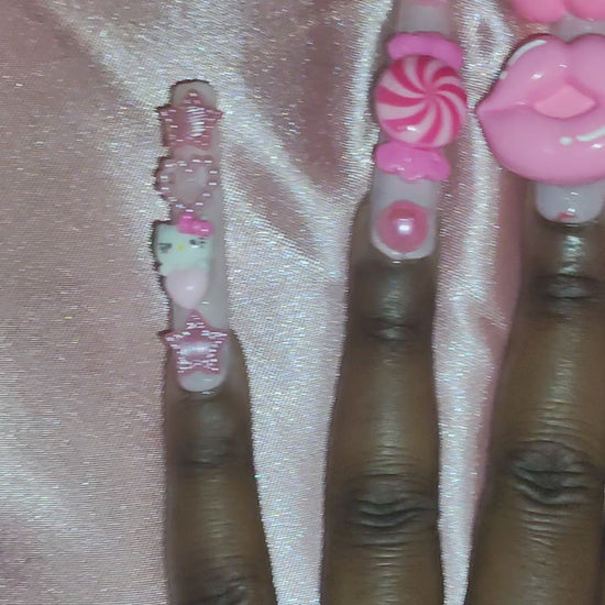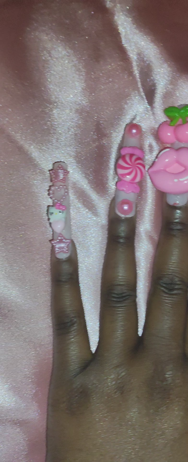 Pastel pink nails embellished with 3D pink charms, this is for all my super pink girls who love all things pink! Comes with a nail kit for proper application!